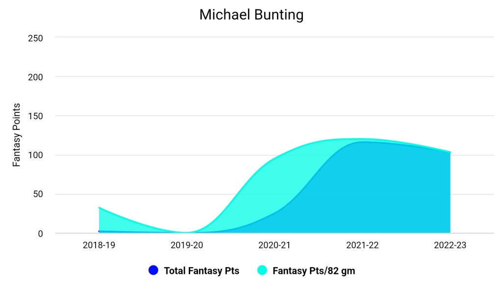 Michael Bunting Fantasy Ownership Drafted by: 2018-19 2 2019-20 0 2020-21 25 2021-22 116 2022-23 Andrew/Dave 103